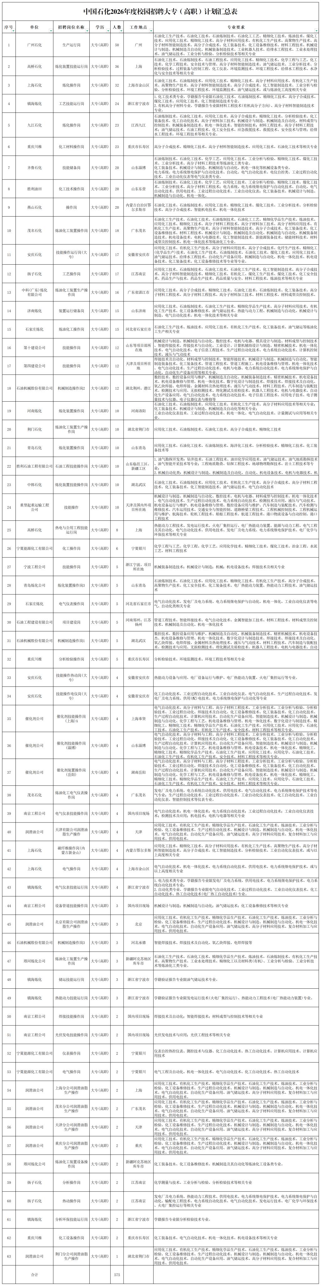 中石化2026年招聘大专(高职)招聘计划汇总表